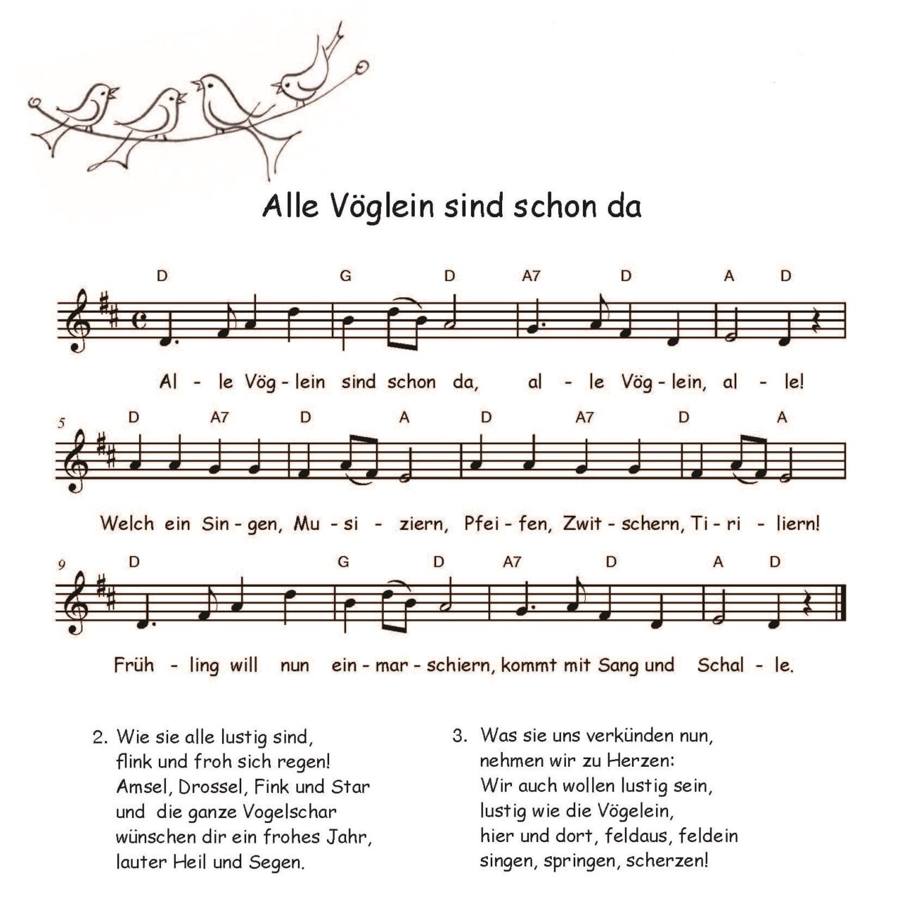 Alle Vögel sind schon da, Alle Vögel, alle! Welch ein Singen, [Musicir'n] 1, Pfeifen, Zwitschern, [Tirelir'n] 2! Frühling will nun einmarschir'n, Kommt mit Sang und Schalle. Wie sie alle lustig sind, Flink und froh sich regen! Amsel, Drossel, Fink und Star, Und die ganze Vogelschaar Wünschet uns ein frohes Jahr, Lauter Heil und Segen.