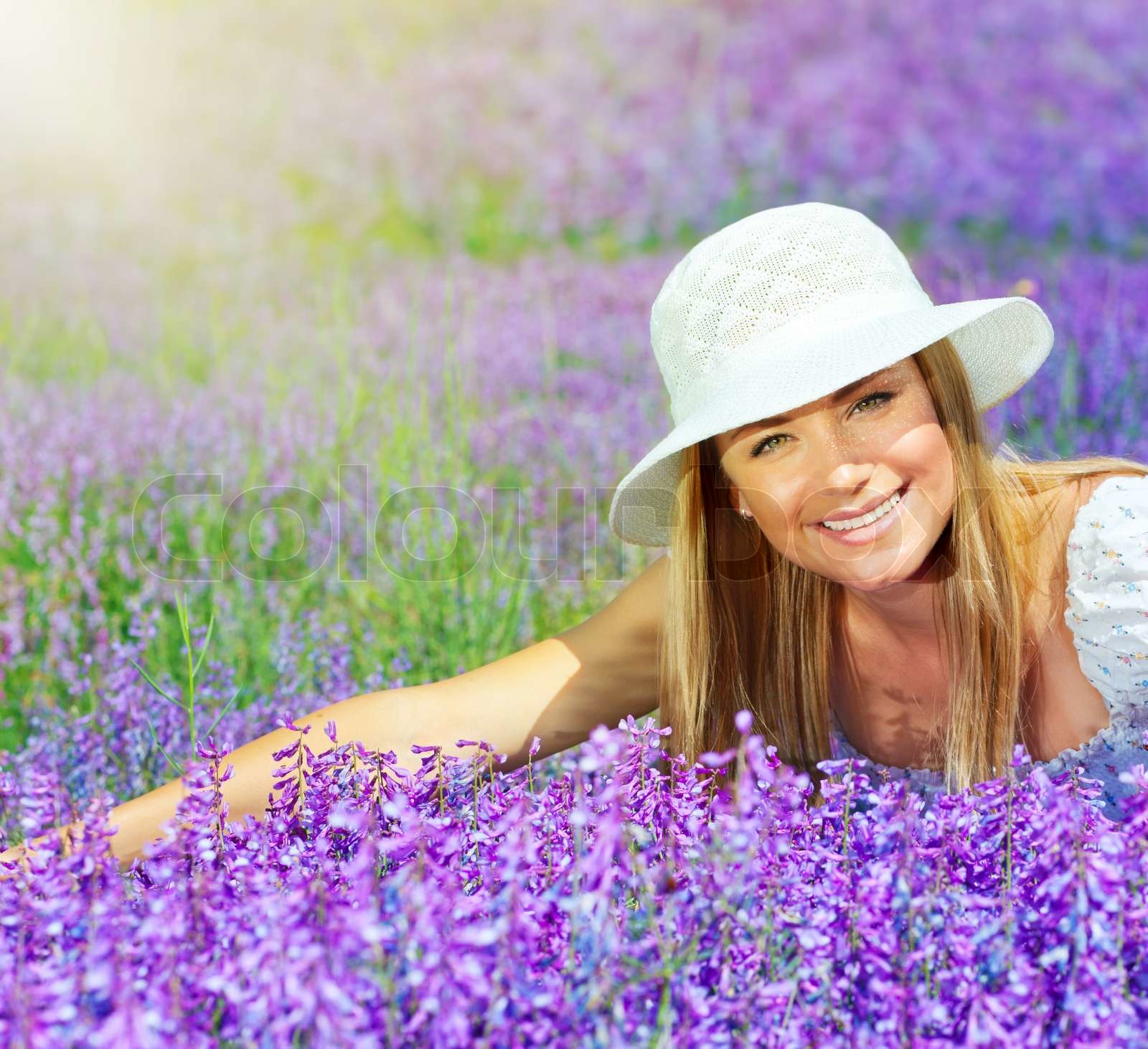 hübsche Frau liegend auf Lavendelfeld am sonnigen Tag, schöne weibliche sitzen auf lila Blumen