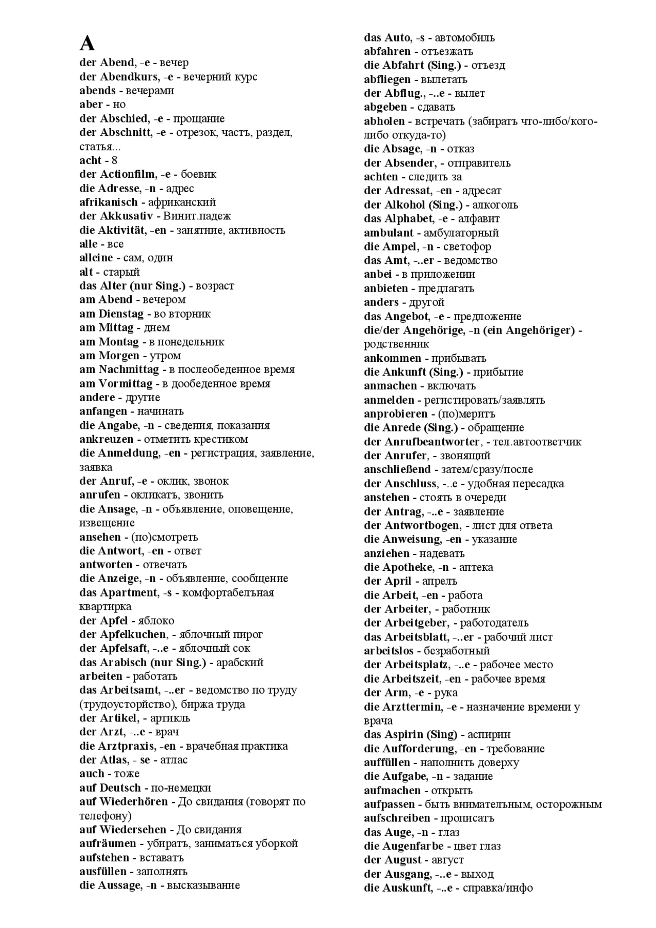 • Для существительных после запятой показаны окончания множественного числа. Две точки после дефиса обозначают необходимость использования умлаута во множественном числе. Например: