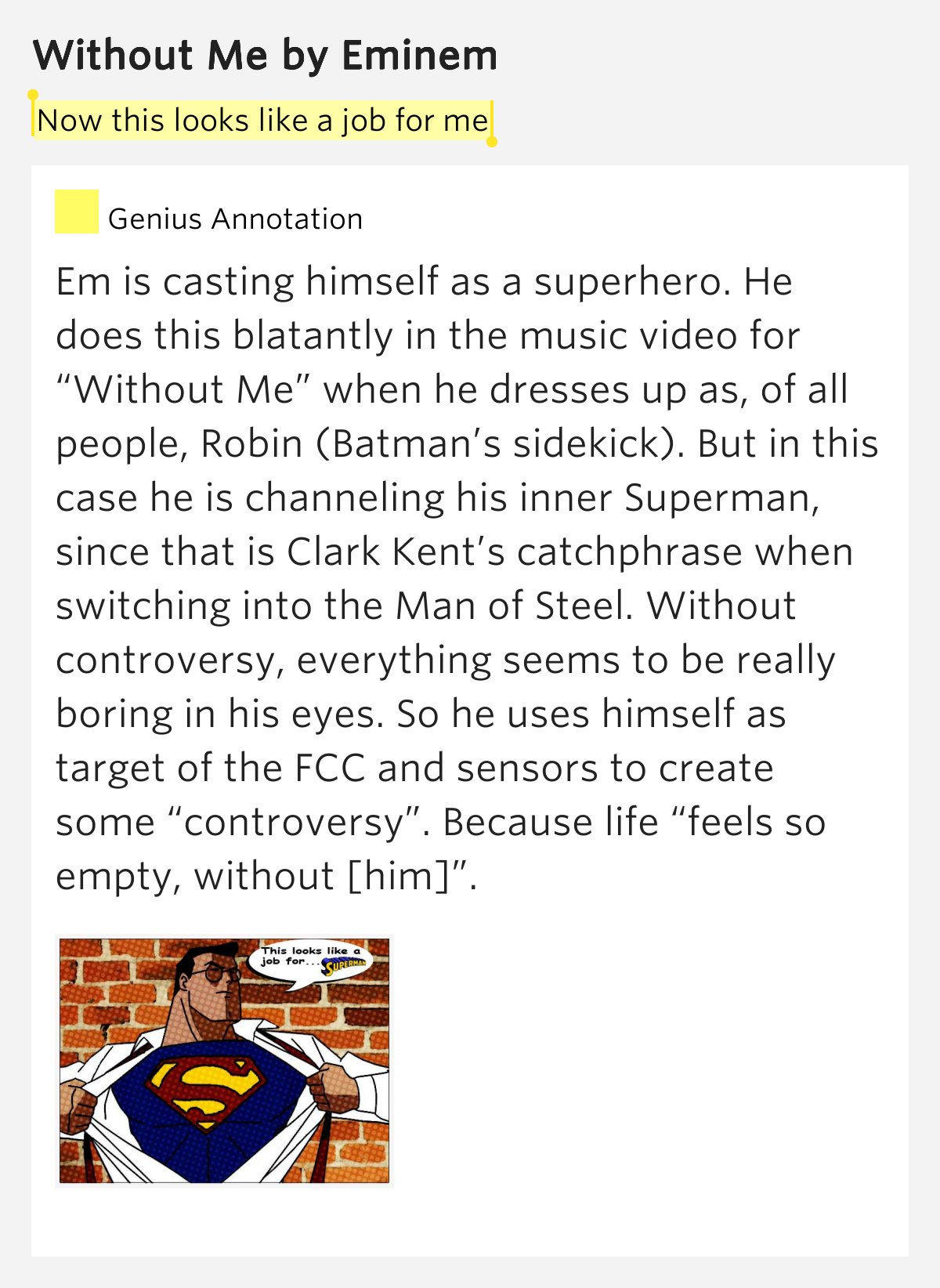 [Chorus: Eminem] Now, this looks like a job for me So everybody, just follow me 'Cause we need a little controversy 'Cause it feels so empty without me I said this looks like a job for me So.